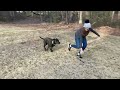 What's a day like with Sally?? First CUDDLES, somersaults in your lap and tummy rubs! Then she'll patiently lay by your feet while you get dressed and cook breakfast. She LOVES a quick sniff walk outside and then enjoys eating breakfaast (especially if you scatter it in the yard or hide it in newspaper inside a cardboard box! Then...NAP! Any chance to play with another big dog or too is awesome! Several games of fetch/tug throughout the day keep me happy! I love to bring the toy back and toss the other end into your hand for more tug. I let go when you say "Give" and LOVE chasing it when you throw it!